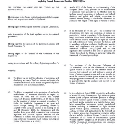 DIRECTIVE 2012/29/EU OF THE EUROPEAN PARLIAMENT AND OF THE COUNCIL of 25 October 2012 establishing minimum standards on the rights, support and protection of victims of crime, and replacing Council Framework Decision 2001/220/JHA